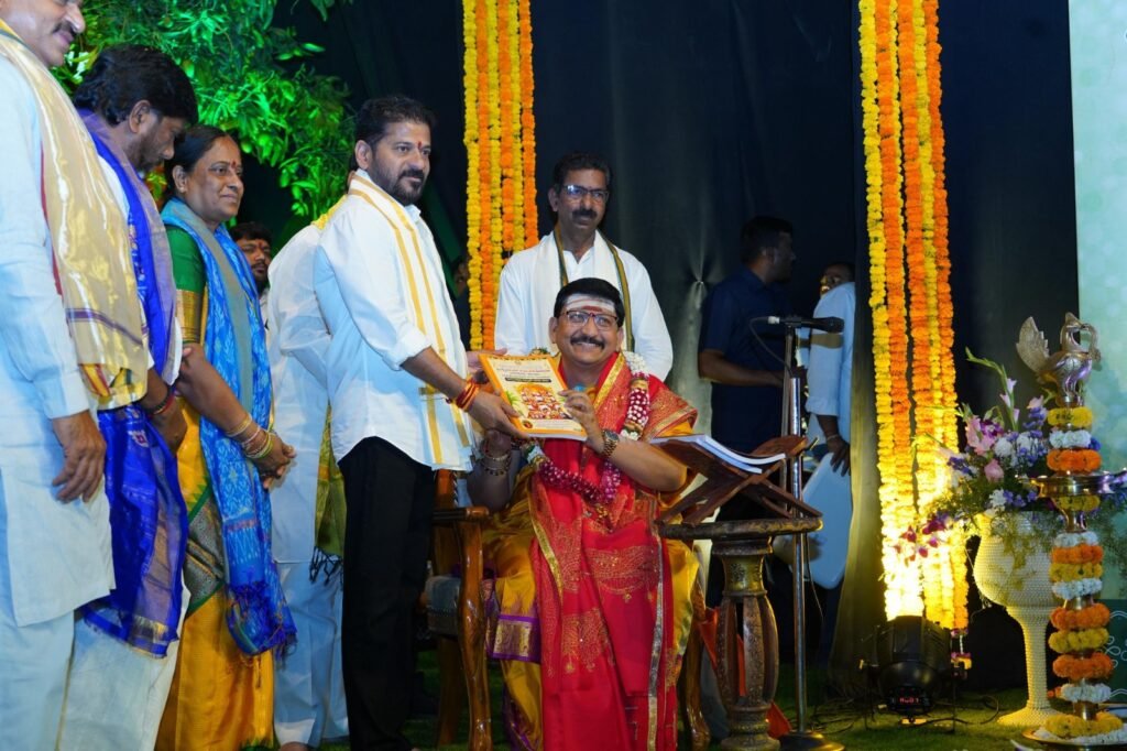 హైదరాబాద్, మార్చి 19 (భారతవాసి న్యూస్): తెలంగాణ భాషా సాంస్కృతిక శాఖ, దేవాదాయ ధర్మాదాయ శాఖల ఆధ్వర్యంలో హైదరాబాద్లోని రవీంద్రభారతిలో శ్రీ పరాభవ నామ ఉగాది వేడుకలు ఘనంగా నిర్వహించారు. ఈ కార్యక్రమంలో ముఖ్యమంత్రి రేవంత్ రెడ్డి, ఉప ముఖ్యమంత్రి భట్టి విక్రమార్కతో పాటు మంత్రులు పాల్గొని వేడుకలను ఆనందంగా జరుపుకున్నారు. ఈ సందర్భంగా ఉగాది పంచాంగాన్ని ఆవిష్కరించారు. కొత్త సంవత్సరానికి సంబంధించిన గ్రహగతులు, ఫలితాలపై వివరాలను అందించేందుకు వేదపండితులు పంచాంగ పఠనం నిర్వహించారు.
